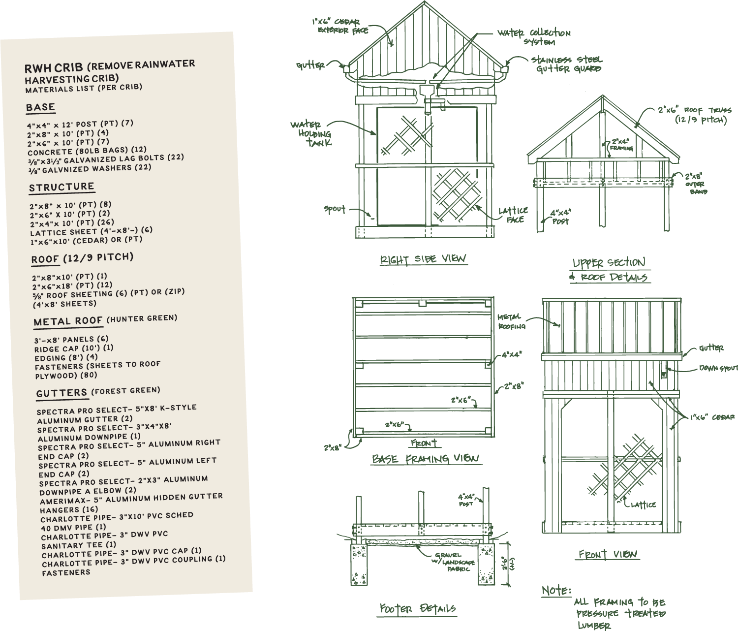 Our goal with the RWH crib design is to allow scaling at any capacity. Since we are starting from raw land, we needed to focus our attention on infrastructure that provides flexibility for future expansion. An example of this would be positioning of the cribs (hilltop) to utilize gravity-fed irrigation, or adding a power source to charge the system to add pumps, automation, etc.